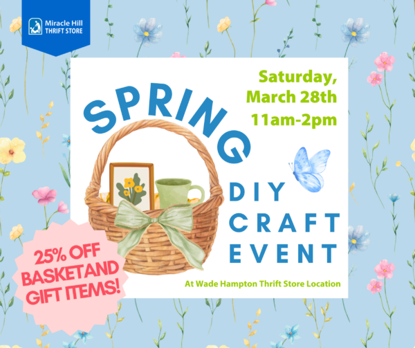Join us between 11:00 and 2:00 for a DIY Basket Making event at the Miracle Hill Thrift Store at 3033 Wade Hampton Blvd in Greenville.